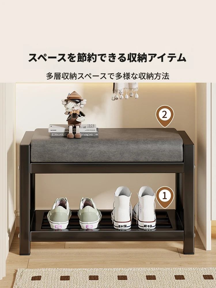 玄関用シューズベンチ - おしゃれなデザインで靴を履くのが楽しくなる!収納機能付きで、リビングや玄関にぴったりな多機能スツール。狭いスペースにもフィットし、整理整頓をサポートします!